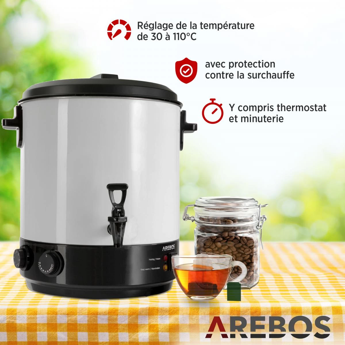 Points forts Arebos AREBOS Stérilisateur et distributeur de boissons chaudes autocuiseur 28 L 1800 W
