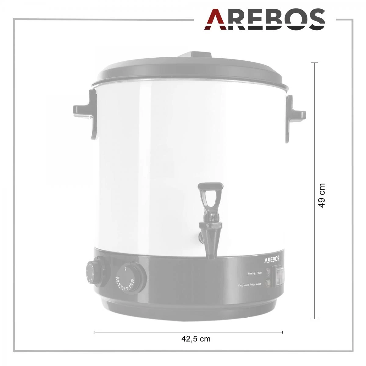 Par les éléments chauffage couverts les plats tels que les goulashs se laissent préparer et réchauffer. Le stérilisateur d’Arebos est aussi utilisable comme distributeur des boissons chaudes à l’aide d’un robinet pratique. Même s’il s’agit du vin chaud ou de la bière chaude, du café ou du thé, des boissons variables se laissent mettre en bouteille.