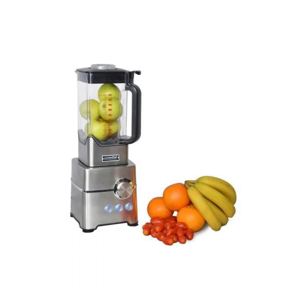 blender ultra puissant 2l 2000w – cy326 – Blender KITCHEN CHEF CY326 est idéal pour réaliser des recettes à base de fruits et de légumes crus ou cuits à basse température afin de profiter pleinement des bienfaits d’une cuisine saine. 4 modes d’utilisation dont 3 fonctions préprogrammées : Pulse, Smoothie (2 minutes) ou Glace Pilée (40 secondes). Mode manuel avec variateur de vitesse de 5000 à 32000 tour/minute. Son moteur surpuissant de 2000 W peut tourner jusqu?à 32000 tr/min et permet ainsi de légèrement chauffer les aliments de manière progressive sans utiliser de résistance en préservant les arômes et les vitamines (sans cuire). La forme carrée du bol et le fond en cuvette dirigent naturellement les aliments vers les 6 lames de coupe permettant ainsi un mélange homogène et un broyage très fin. – Matière du bol : Plastique.