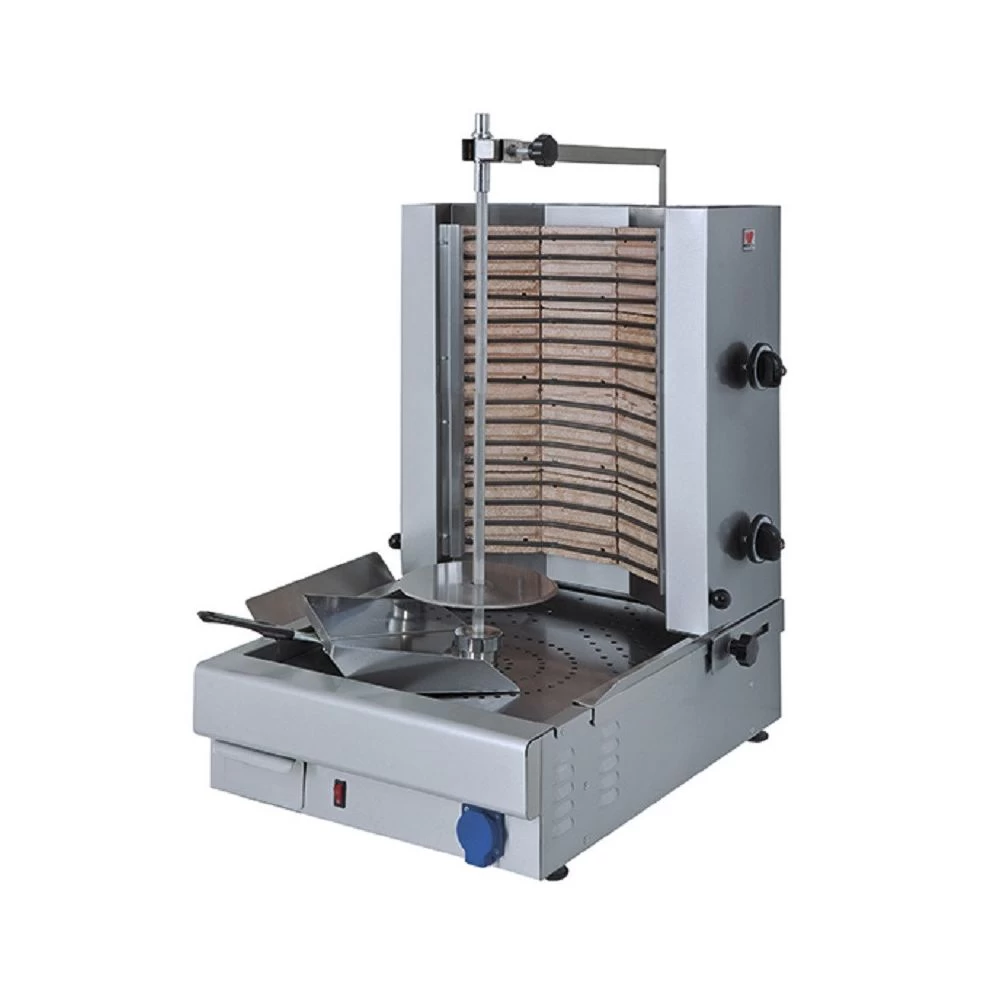 Gril à kebab professionnel électrique entièrement en acier inoxydable AISI 304. Cette broche kebab électrique dispose de 2 zones de cuisson réglables séparément, ainsi qu’un dispositif simple de mise en place de la broche, mais aussi un support de broche totalement hermétique. Broche kebab avec résistances blindées en inox et pierre réfractaire avec des dimensions (L x P x H) mm de 480 x 540 x 880 pour une capacité de viande de 35 kg. | Entièrement en acier inoxydable AISI 304 Zones de chauffe réglables individuellement pour adapter la cuisson à la hauteur Mise en place aisée de la broche grâce à un dispositif mécanique simple Le support de broche est complètement hermétique, le moteur est ainsi protégé de toute infiltration de graisse ou jus de viande Monté sur roulement à billes, il ne supporte ni le poids de la viande ni les à-coups de l’utilisateur et donc protégé de toutes torsions Chauffage par résistances blindées en acier inox traitées incoloy, avec pierre réfractaire permettant d’accumuler la chaleur Régulation par commutateurs Permet de griller facilement, rapidement et sans déperdition de chaleur Le plat collecteur de graisses peut-être détaché en quelques secondes pour être nettoyé très rapidement 2 niveaux de cuissons 2 régulateurs de température Capacité : 35 kg de viande Puissance totale : 6,4 kw Dimensions (L x P x H) mm : 480 x 540 x 880 Vitesse moteur : 1,8 rpm Moteur d’entrainement : inférieur Zone de chauffage : 2 Alimentation électrique :400 V/3+N/50 Hz Poids : 55 kg