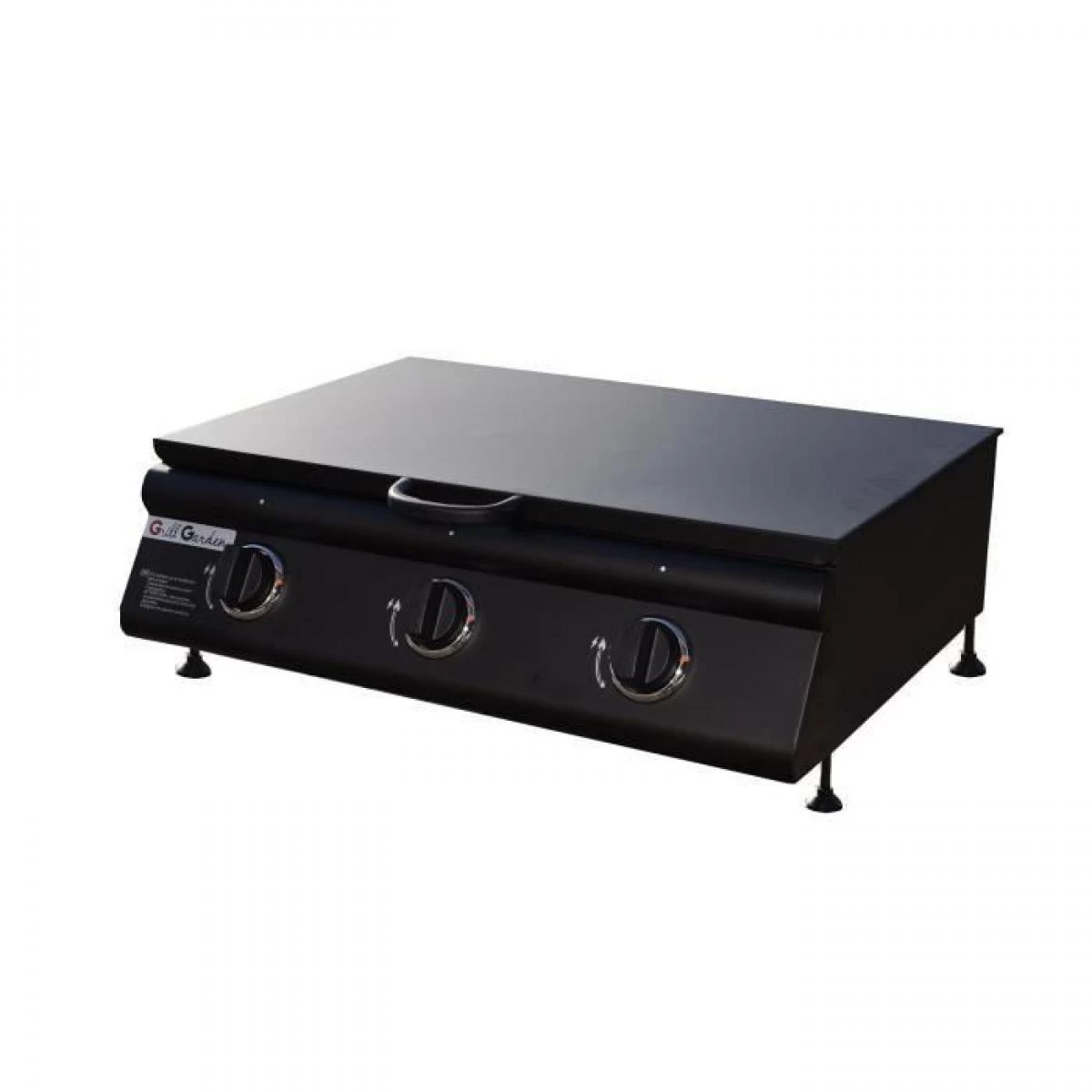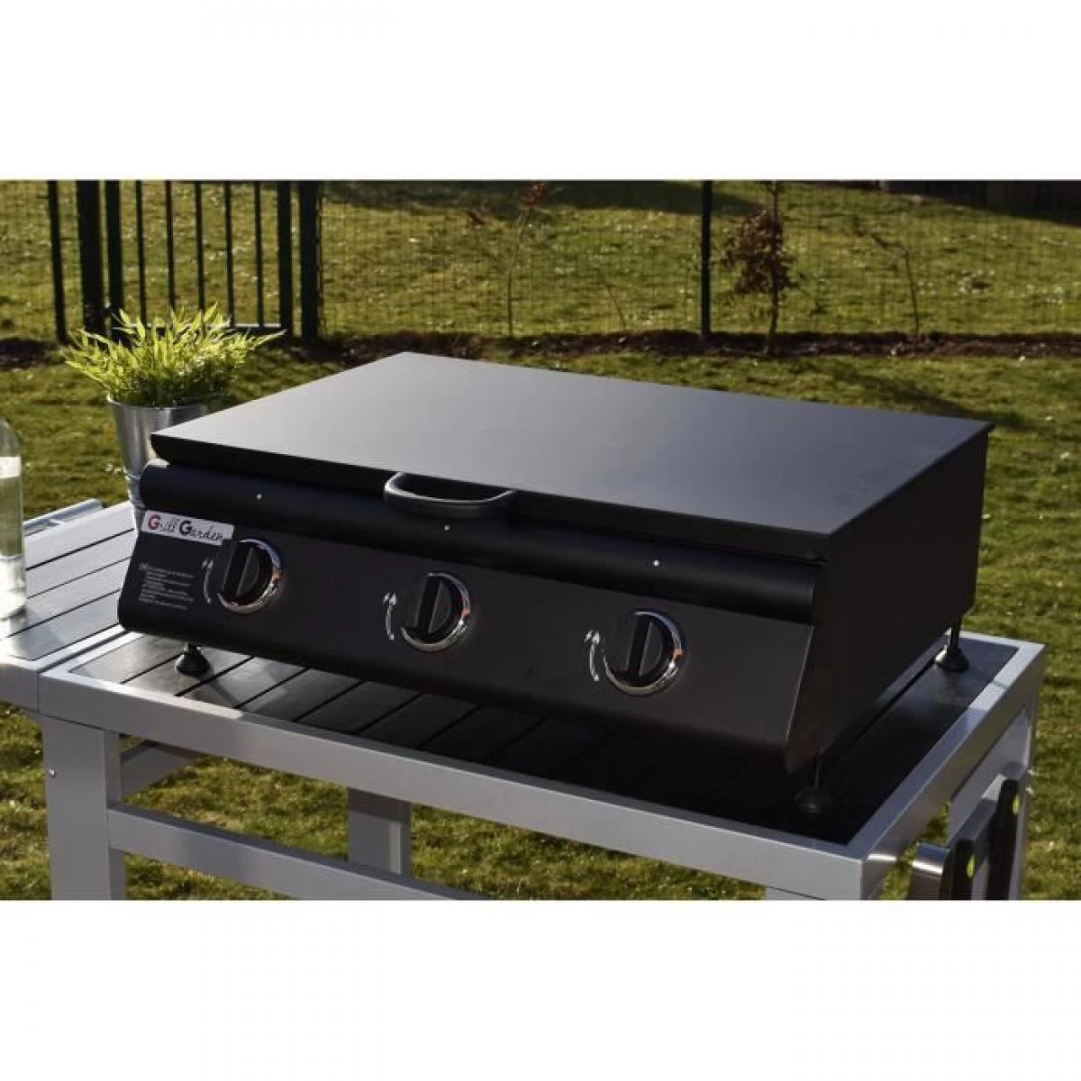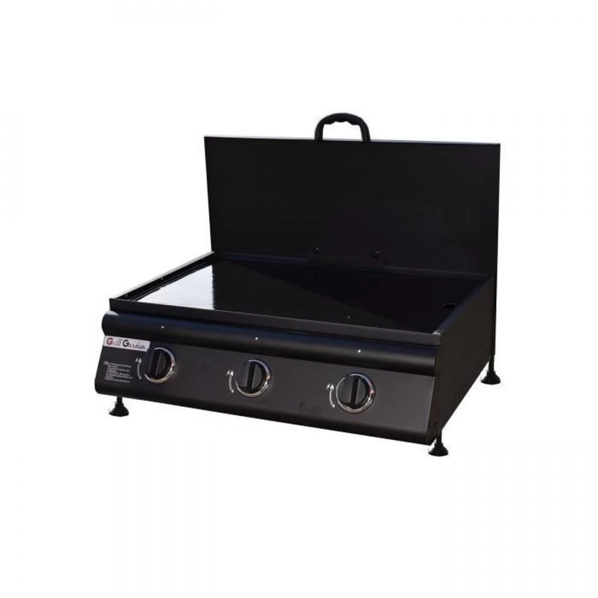 GRILL GARDEN Plancha gaz a poser avec couvercle 3 brûleurs – Inox – 10,5 KW – 62 x 41,5 cm – Noir mat