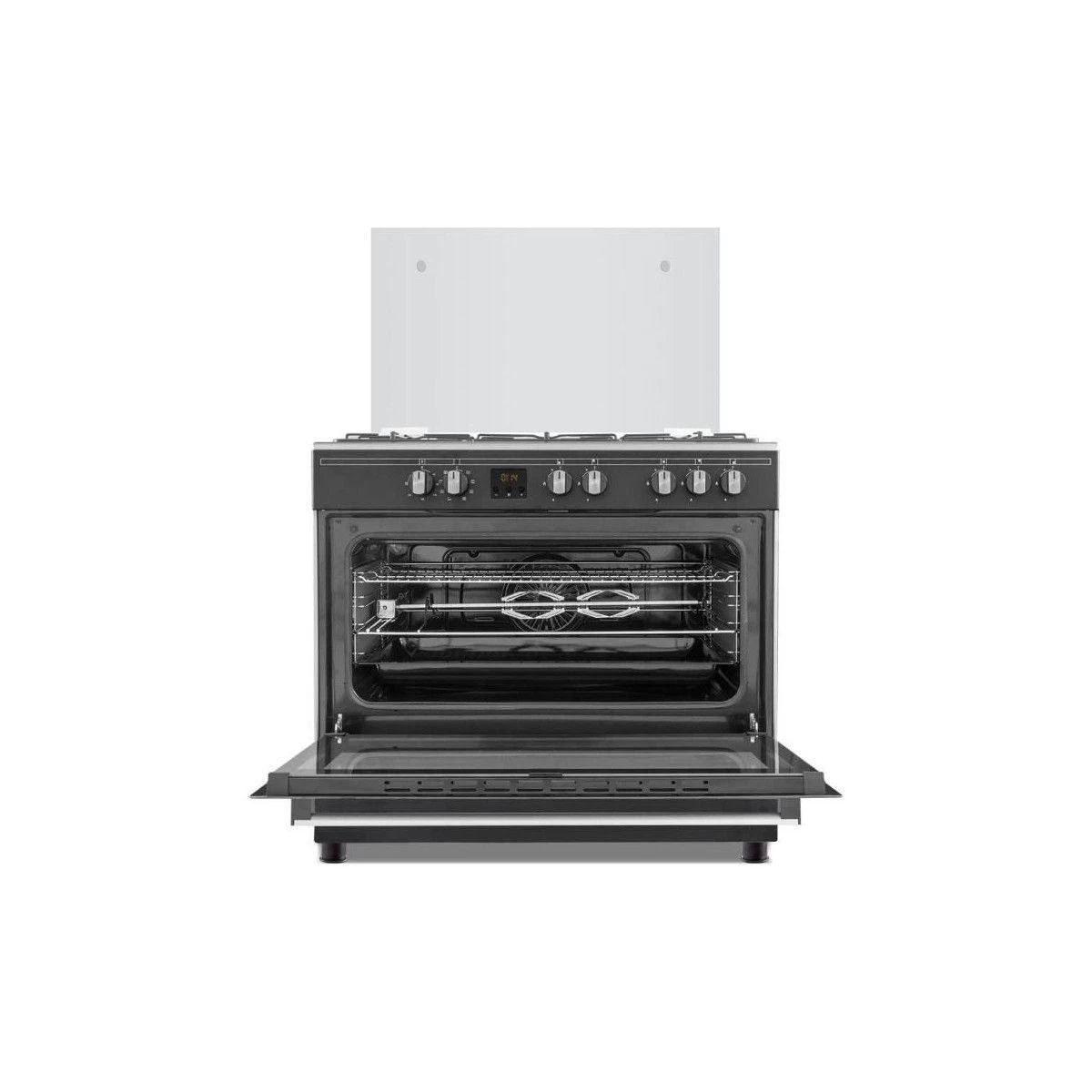 Cuisiniere piano, table de cuisson inox, 5 foyers gaz, allumage 1 main, four catalyse 100L, 8 programmes, multifonction, gril, éclairage intérieur, minuteur, affichage digital, porte du four démontable, pieds réglables, NOIR MAT, Garantie 2 ans pieces main d’oeuvre et déplacement