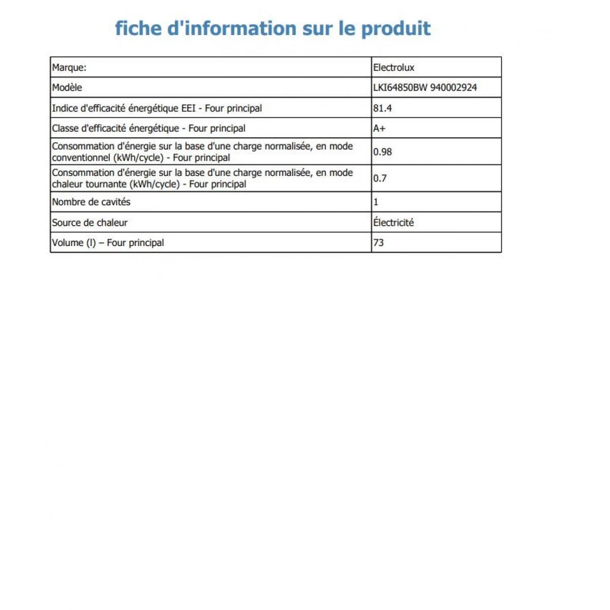 Indice d’efficacité énergétique (EEI cavité principale) : 81.4.