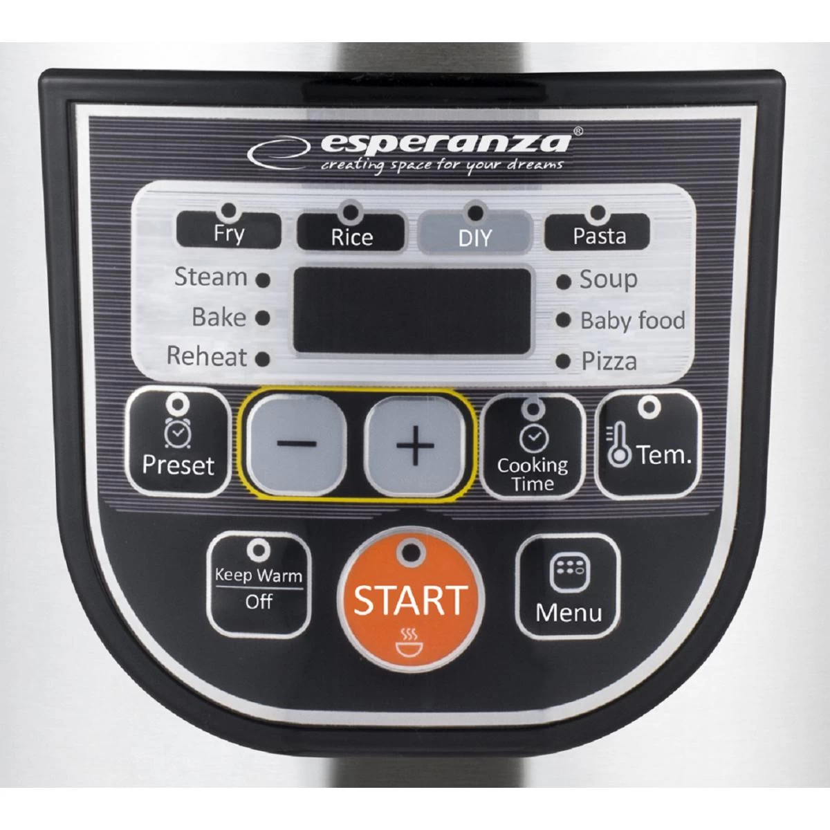 Vous pouvez régler le multicuiseur Esperanza via l’écran de l’appareil lui-même. Vous pouvez donc allumer le multicuiseur et faire autre chose. Cuisson sûre et rapide, avec beaucoup moins de dégâts et un nettoyage facile.