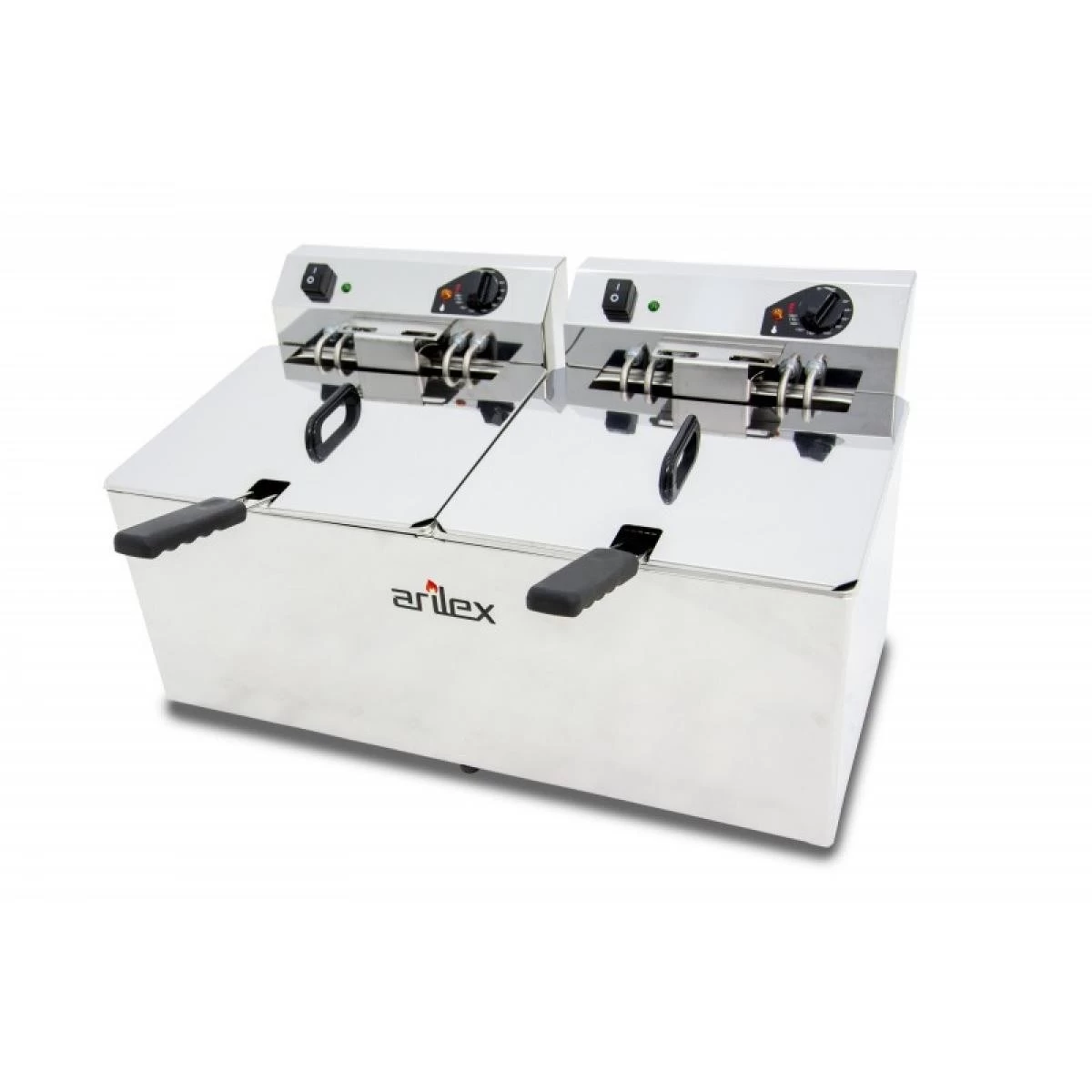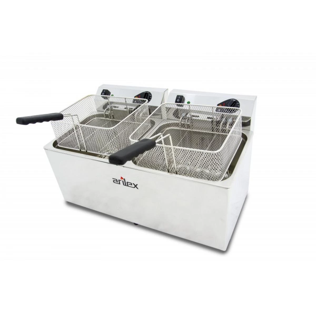 Arilex Friteuse Electrique Double Evolution | Cube intérieur en acier inoxydable sans angle et avec les marques de MAX-MIN du niveau d’huile.Résistance blindée en acier inoxydable.Thermostat de sécurité de grande qualité, réglé à 240°C avec réarmement manuel.Système de fixation du panier qui facilite la vidange de l’huile du panneau de commande.Modèles G équipés d’une vidange d’huile au fond du seau qui permet une vidange complète et un nettoyage facile. Egalement fourni avec un filtre anti-résidu qui empêche le drain de se boucher.”Zone froide” où se déposent les restes des aliments frits en dessous de la résistance. Ainsi, ils ne se cuisent pas de nouveau et ne se mélangent pas aux fritures suivantes, afin d’éviter le mélange de saveurs.Paniers robustes en acier inoxydable avec poignée en bakélite “à froid”. Dimensions (LxPxH) mm: 290x245x110.Panneau de commande électrique entièrement étanche et amovible pour un meilleur nettoyage.Thermostat de travail de grande qualité réglable jusqu’à 190°C/20A.Micro-interrupteur de sécurité qui évite que la résistance continue de fonctionner lorsque la tête est extraite.Friteuses équipées de contactor.EVO1212GTR : Capacité (L) : 12 + 12Capacité huile (L) : 10 + 10Robinet : OuiPuissance (KW) : 7,5 + 7,5Tension (V) : 380Dimensions (LxPxH) mm : 695x495x325Poids : 30 KgEVO1212TR : Capacité (L) : 12 + 12Capacité huile (L) : 10 + 10Robinet : NonPuissance (KW) : 7,5 + 7,5Tension (V) : 380Dimensions (LxPxH) mm : 695x495x325Poids : 28 Kg