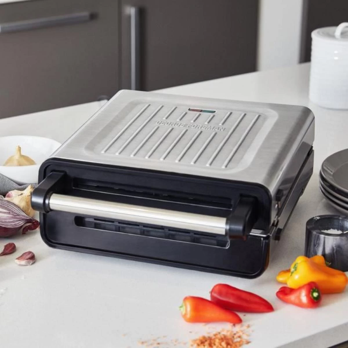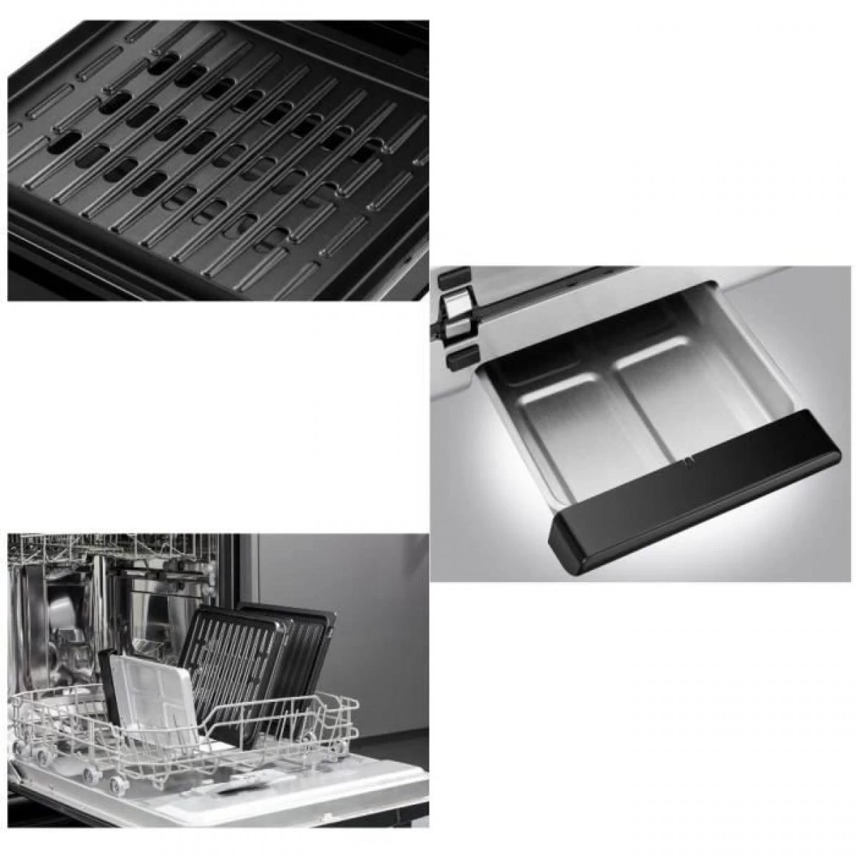 Technologie sans fumée – Systeme de ventilation intégré qui permet de cuisiner avec jusqu’a 87% moins de fumée* – Température unique – Revetement antiadhésif – 3x plus rapide qu’un four électrique conventionnel – Plaques de gril et plateau d’égouttement amovibles, allant au lave-vaisselle
