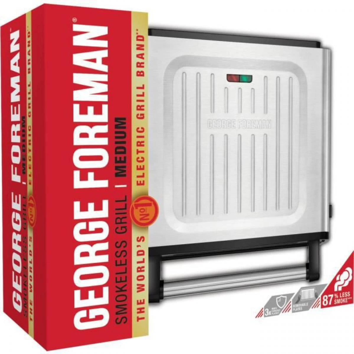 Points forts George Foreman George Foreman 28000-56 – Grill Sans Fumée – 1500W – Boîtier en Acier Inoxydable – Revetement Antiadhésif
