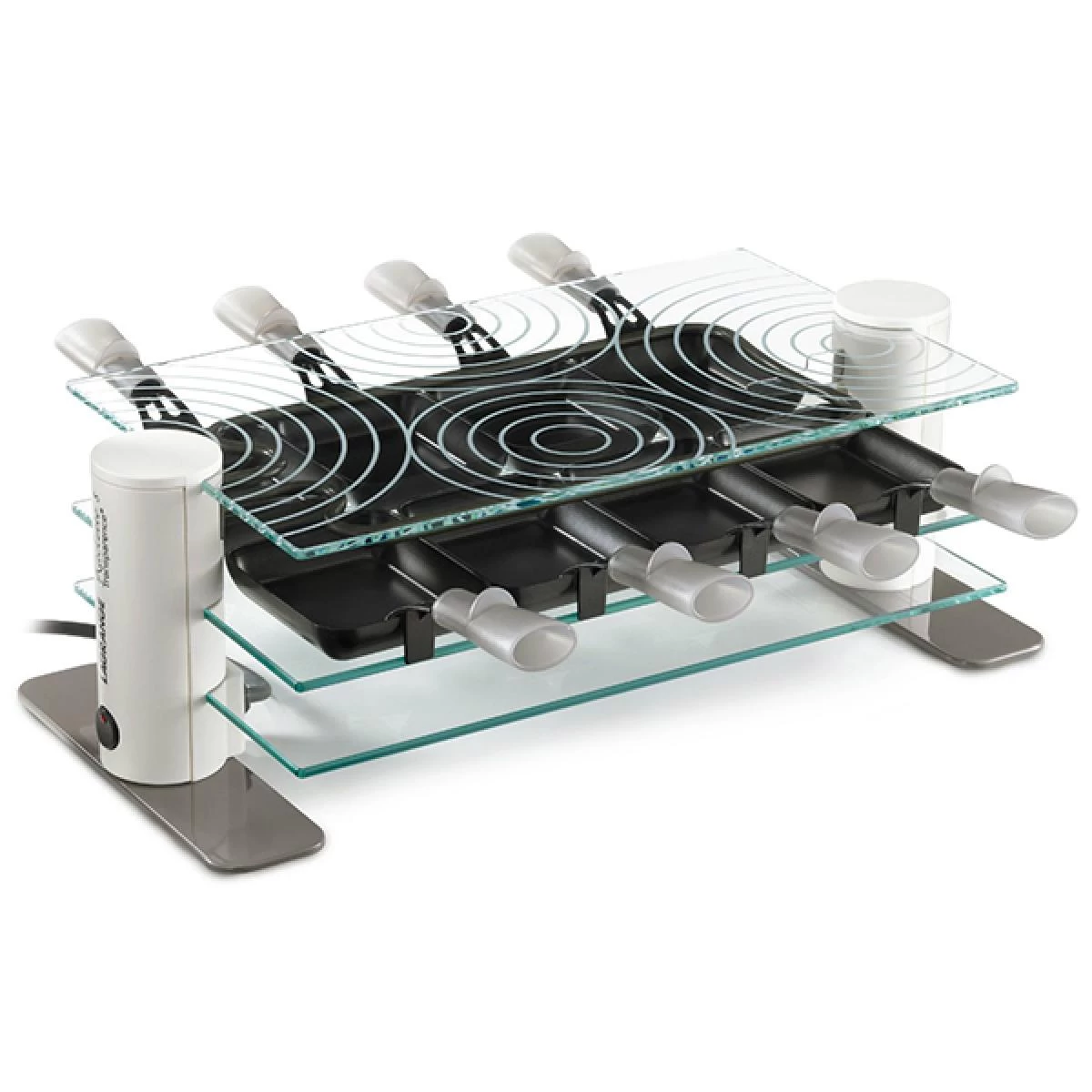 Les plateaux en verre transparent ultra résistant permettent à chacun de vérifier la cuisson et de retirer son poêlon dès que le fromage est à sa convenance!