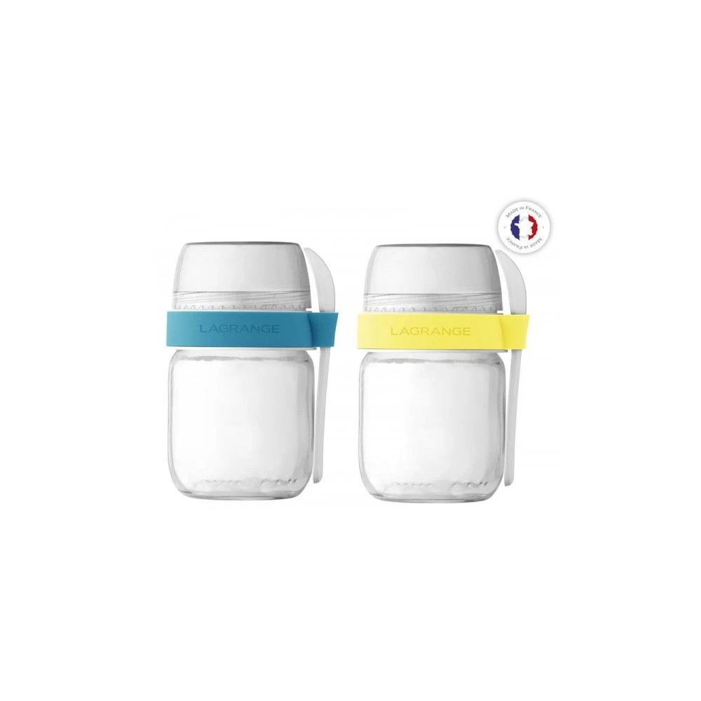 lot de 2 pots en verre pour yaourtière – 440401 – Lot de 2 pots en verre compartimentés Lagrange 440401 pour yaourts à emporter avec petite cuillère incluse.Pratique : pots en verre compartimentés vendus par lot de 2 et pouvant contenir des graines, muesli, sirop, compote ou encore du miel. Ces yaourts s’emportent hors du domicile pour se consommer en en-cas en mélangeant le contenant des pots compartimentés au yaourt. Une petite cuillère est fournie pour permettre de consommer ces yaourts agrémentés.Adaptable : les 2 pots en verre sont compatibles avec les autres pots à yaourt Lagrange et peuvent se nettoyer au lave-vaisselle ou à la main.3 références disponibles : bagues siliconées Citron&Céleste (jaune et bleu) – référence 440 401, bagues siliconées Pamplemousse&Chlorophylle (corail et vert) – référence 440 402 et bagues siliconées Praline rose&Curacao (rose et bleu ciel) – référence 440 403. – Type de produit : Pots de yaourts à emporter.