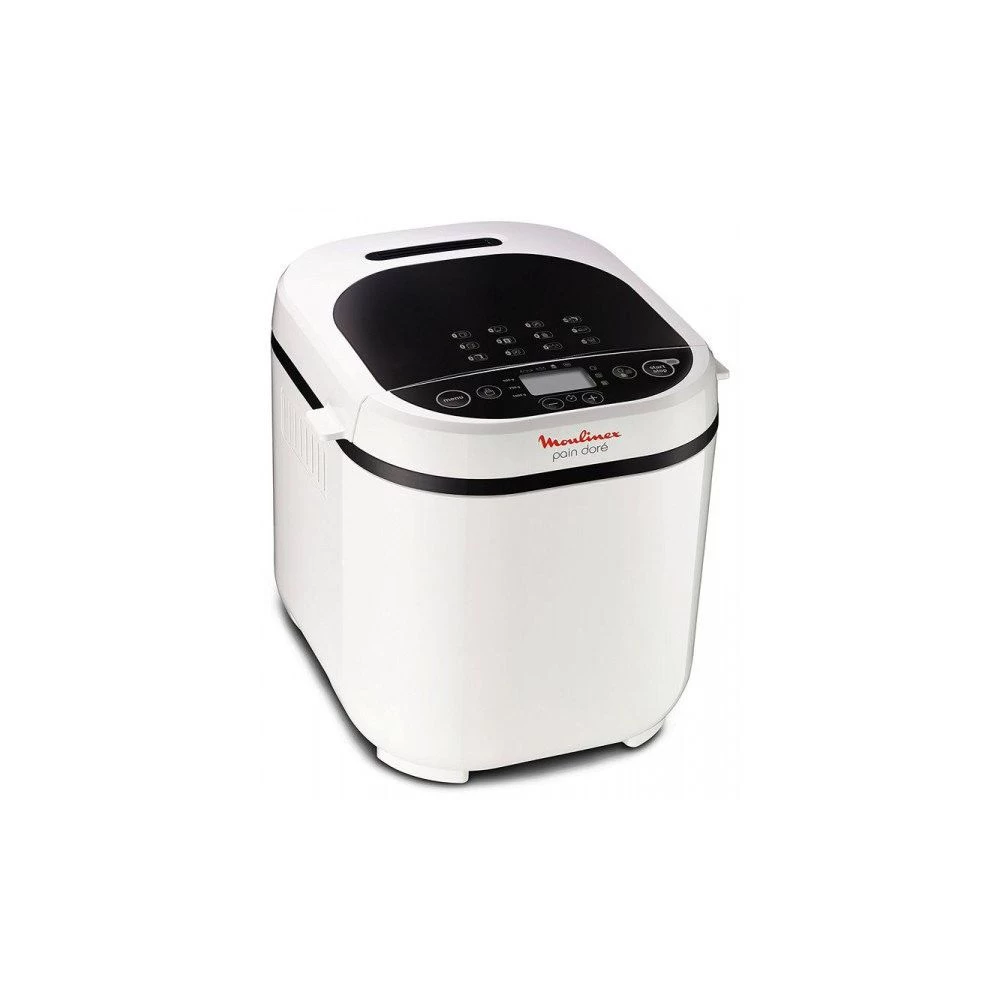 machine à pain 1kg 720w blanc – ow210130 – Machine à pain Pain Doré Moulinex OW210130Du pain, tout simplementRéalisez votre pain en toute simplicité12 programmes automatiques pour réaliser vous même du pain, des fraîches), des confitures et du porridge.Comprend des programmes pour préparation sans gluten et pain de seigle.Pain Doré, la solution pour réaliser en toute simplicité du bon pain frais maison !Savourez du bon pain maison tous les matins ! Tellement facile à utiliser : il suffit de mettre les ingrédients en suivant les instructions et de programmer la machine. Pain Doré travaillera pour vous.12 programmes entièrement automatiques à portée de main vous permettront de réaliser des préparations maison :- Pain basique, pain français, pain sucré, pain de seigle, pain complet, pain sans gluten et pain rapide.- Cake, confiture, porridge.- Pâte levée et programme cuisson.Bénéfices du produit :Du pain frais en quelques étapes!Tout est automatique. Placez vos ingrédients dans la cuve, sélectionnez le programme et la machine à pain travaille pour vous : du pétrissage à la cuisson.Facile à utiliser !Interface intuitive avec affichage des paramètres sélectionnés sur le large écran, pour un maximum de simplicité.3 réglages de poids et 3 niveaux de dorageDes pains de 500 g à 1 kg pour les petites et les grandes faims.Sélectionnez la couleur de la croûte : pain légèrement doré à très croustillant.Du bon pain frais à toute heure !Départ différé jusqu’à 15 heures et fonction automatique de maintien au chaud pendant 1 heure.Livre de recettes inclusPas besoin d’être un chef pour faire du bon pain à la maison. Le livret de 11 recettes décrit en images les étapes du process, pour réaliser du pain en toute simplicité, tel que du pain français, du pain rapide ou du pain complet, mais aussi des confitures, de la pâte à pizza et des cakes.Facile à nettoyerCuve amovible antiadhésive pour démouler facilement le pain. Compatible lave-vaisselle. – Puissance : 720 W.