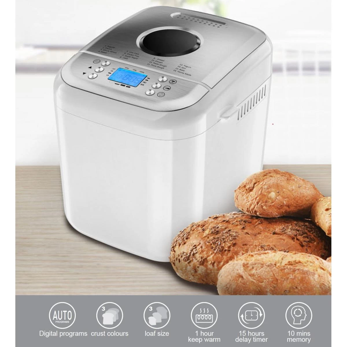 - 19 programmes : basique, baguette, pain complet, pain blanc, rapide, pain sucré, sans gluten, pâte, confiture, gâteau, sandwich, spécialité, cuisson, fait maison, yaourt, pétrissage…