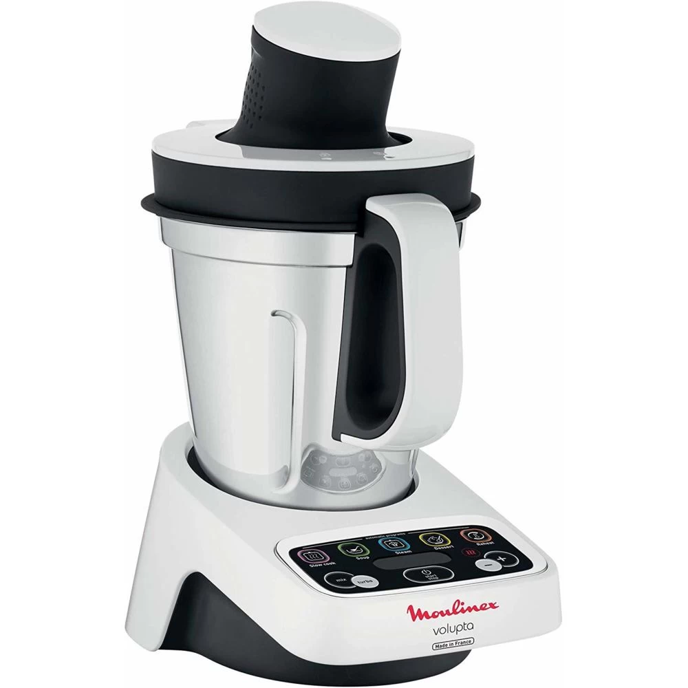 Le robot cuiseur multifonctionsVolupta HF404110 de Moulinex va devenir votre plus fidèle allié dans votre cuisine ! En deux clics, vous réussirez de nombreuses préparations et cuissons, pour une cuisine rapide et facile au quotidien.Vous devez simplement suivre les recettes et il s’occupe de tout ! Préparez, lancez le programme et le tour est joué.Livré avec 5 accessoires, c’est un appareil polyvalent et performant.Compact, il trouve sa place dans toutes les cuisines et sur tous les plans de travail.Capacité et puissance :Le robot cuiseur est doté d’une puissance 1000 Watts et sa capacité brute est de 3 litres (capacité utile 1,5 l), idéale pour environ 4 personnes.Il est adapté à toutes les cuissons et préparations : préparez des apéritifs, des sauces, des entrées, des soupes, des poissons et des viandes, des plats mijotés, des légumes, des compotes, des desserts ! Tableau de commandes :Le Volupta est équipé d’un large panneau de commande avec écran LCD, facile à utiliser et intuitif.Sélectionnez le programme puis appuyez sur le bouton Marche, et laissez Volupta cuisiner pour vous en 2 clics.Programmes :Volupta dispose de 5 programmes et sous programmes automatiques, et une fonction Mix pour une utilisation simple et rapide.- Plats Mijotés : 5 sous programmes : sauce tomate /rissoto/ mijoté de poisson au safran/ rissolé de l’oignon.- Sauces et Soupes : 2 sous programmes : velouté de courgettes / mouliné carotte pomme de terre.- Cuisson Vapeur, parfaite pour une cuisson saine et pleine de saveurs !- Dessert : 4 sous programmes : compote de pomme/ riz au lait/ fondu chocolat/ quatre quart.- RéchauffageA cela s’ajoute une touche Mix et touche pulse vous permettant de réaliser toutes vos préparations. Vous n’avez plus qu’a choisir l’intensité de la vitesse (3 vitesses + 1 intermittente).Températures et cuisson : Réglez la température de cuisson selon vos préparations de 55° jusqu’à 120°C.Le temps de préparation est réglable de 10 secondes à 2h30 minutes.Pratique, plus besoin de surveiller une fois que votre plat est cuit, Volupta passe automatiquement en mode “”maintien au chaud””.Accessoires :Volupta est livré avec 5 accessoires pour réaliser des préparations variées au quotidien :- couteau hachoir en inox : affûté, il est idéal pour hacher légumes, herbes, viande, poisson et mixer soupes et compotes de manière homogène et rapidement. Associé à la cuisson, il permet de réaliser des soupes et des sauces.- panier vapeur : permet de cuire les aliments à la vapeur pour des plats gourmands, sains, légers et naturels. Légumes, poissons, viandes et desserts… à vous de choisir !- mélangeur : utilisez-le pour mélanger les ingrédients sans les abîmer, il effectue une action douce. C’est l’accessoire indispensable pour les plats cuisinés, les préparations sucrées ou pour faire fondre du beurre ou du chocolat.- couteau pour pétrir et concasser : son utilisation est dédiée au mélange des pâtes légères (pâte à crêpes, gaufres…), au concassage des fruits secs et au pilage de la glace pour déguster un sorbet maison.- batteur : il est conçu pour battre les œufs ou la crème, émulsionner la mayonnaise et les sauces en rendant les préparations mousseuses et aérées.De plus, un livre de recettes est fourni dans lequel vous trouvez 100 recettes pour varier vos menus ! Ne manquez plus d’inspiration et laissez-vous guider. Partez à la découverte de plats inconnus ou redécouvrez les saveurs de votre enfance ! De l’entrée jusqu’au dessert, le livre vous propose des idées de menus du quotidien ou pour des occasions spéciales. Crème de lentilles, one pot pasta aux légumes, salade de pommes de terre, gâteau au yaourt et petits pots de crème à la vanille…. autant de recettes simples mais délicieuses du quotidiens !Praticité :Pour plus de confort : l’appareil est doté d’une poignée large pour une meilleure utilisation et d’un bol léger et assez haut pour verser plus facilement et sans éclaboussure.Pour faciliter le rangement de votre appareil, les accessoires se rangent dans le bol.Entretien facile :Le bol, les accessoires, le couvercle et l’embout couvercle (exceptée la base et le couvercle) sont compatibles lave-vaisselle.