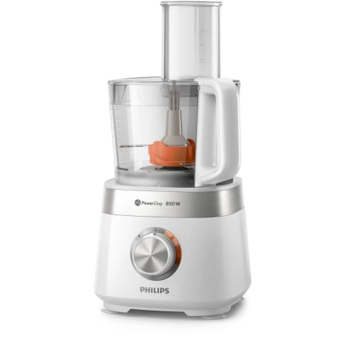 Nouveau robot de cuisine Philips Viva Collection avec technologie Powerchop. Moteur puissant de 850 W et une polyvalence maximale pour préparer des centaines de plats différents. Bol de 2,1 l en acier inoxydable 2 en 1 pour couper et hacher, lame pétrir, disque émulsifiant, bol mixeur 1,75 l, mini hachoir et presse-agrumes.