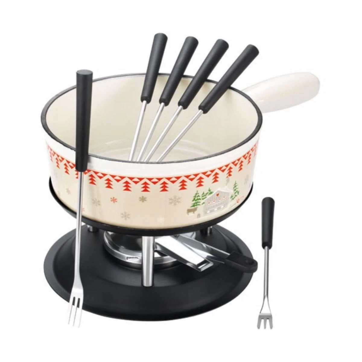 poêlon savoyard en fonte émaillée 22cm beige – 403816 – Ce service à fondue Aravis 403816 de Table & Cook vous accompagnera pour des soirées fondue inoubliables ! Poêlon en fonte émaillée de diamètre 22 cm. Coloris Beige décoré d’une frise montagnarde représentant un chalet et un paysage montagnard enneigé. Livré avec 6 fourchettes à fondue 3 dents, un réchaud en métal et un brûleur. Nettoyage facile : le caquelon passe au lave-vaisselle. Poêlon compatible tous feux dont induction. – Type de produit : Service à fondue