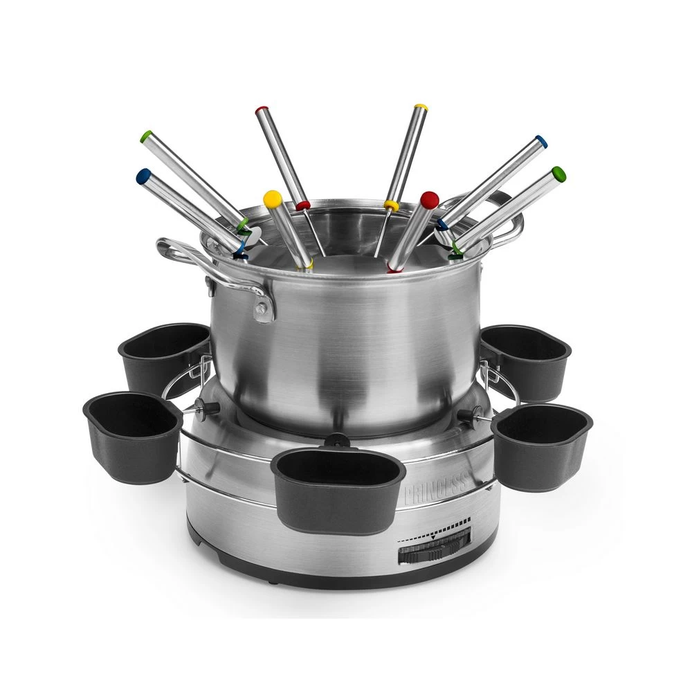 Kit appareil à fondue familial 172680-01-001 en acier inoxydable. Faire de la fondue, c?est sympa, mais ça peut être un problème si vous utilisez une bougie chauffe-plats ou de la pâte à brûler. L?appareil à fondue Princess 172680 Family Fondue Set met l?ambiance à la maison. Vous pouvez facilement régler la température avec le thermostat. Cela fait que cet appareil à fondue convient aussi pour la fondue au chocolat, au fromage et la fondue bourguignonne. Le couvercle anti-éclaboussures maintient les fourchettes en place et vous pouvez présenter les sauces dans l’anneau pratique.Caquelon double paroi pour une distribution optimale de la chaleurLe caquelon en acier inoxydable a un fond à double paroi qui permet de s’assurer que la chaleur est répartie uniformément. Grâce à cela, l?appareil à fondue Princess est adaptée à la fondue traditionnelle aux fromages suisses, mais peut aussi être utilisée pour une fondue bourguignonne ou une délicieuse fondue au chocolat. Vous pouvez facilement remplir le caquelon à fondue à moitié, et aussi retirer le caquelon de la base en toute facilité.Pour 8 personnes au maximumAvec l?appareil à fondue Princess Family Fondue Set, vous recevez 8 fourchettes à fondue en acier inoxydable, ayant chacune un code couleur pour vous puissiez profiter d?une fondue avec toute votre famille. L?anneau porte-coupelles de sauce pratique peut être utilisé pour servir des sauces, mais aussi pour des garnitures sucrées pour une fondue au chocolat, comme de la noix de coco râpée ou des paillettes de chocolat. Le thermostat réglable avec une puissance de 800 W vous permet de définir la température optimale pour tout type de fondue.Facile à nettoyerGrâce au caquelon amovible et lavable au lave-vaisselle, l?appareil à fondue Princess Family Fondue Set est très facile à nettoyer. Les fourchettes et les coupelles à sauce peuvent également passer au lave-vaisselle. Vous pouvez nettoyer la base avec un chiffon doux et humide.Contenu de l’emballage :Appareil à fondue Princess Famille Fondue Set, 8 fourchettes à fondue, anneau avec 6 coupelles à sauce, mode d?emploiLes raisons de choisir l’appareil à fondue Princess Family Fondue Set :Une fondue au chocolat ou une superbe fondue bourguignonne, on peut y faire toutes sortes de fondue.Plus de tracas avec des bougies chauffe-plat grâce au thermostat réglable.Servez vos sauces et vinaigrettes dans les 6 coupelles de l’anneau.Caquelon en acier inoxydable, amovible avec fond à double paroi pour une distribution optimale de la chaleur.Facile à nettoyer grâce aux pièces pouvant aller au lave-vaisselle.Voltage : 230 V.