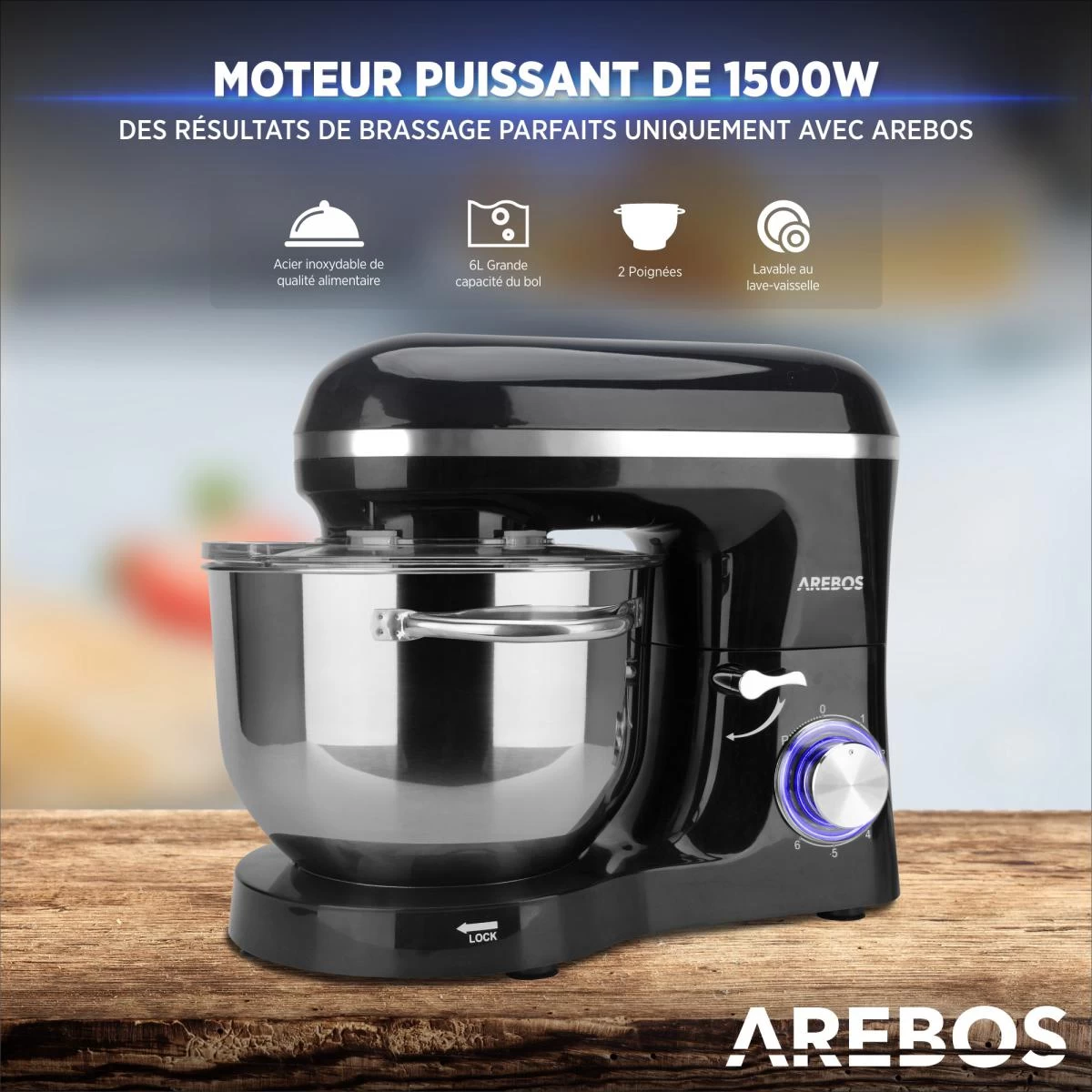 Points forts Arebos Robot de Cuisine 1500W 6L Acier inoxydable-Bol mélangeur 6 étapes Noir