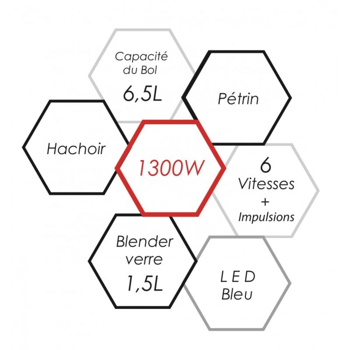 Bol inox d’une capacité de 6,5L Hachoir à viande Blender en verre – Capacité 1,5L Mouvement planétaire pour un mélange parfait Inclinaison du bras avec bouton de verrouillage Protection contre les surcharges Sélecteur 6 vitesses de rotation + fonction Impulsions Puissance 1300W Crochet pétrisseur Fouet Batteur plat Couvercle Anti Eclaboussures