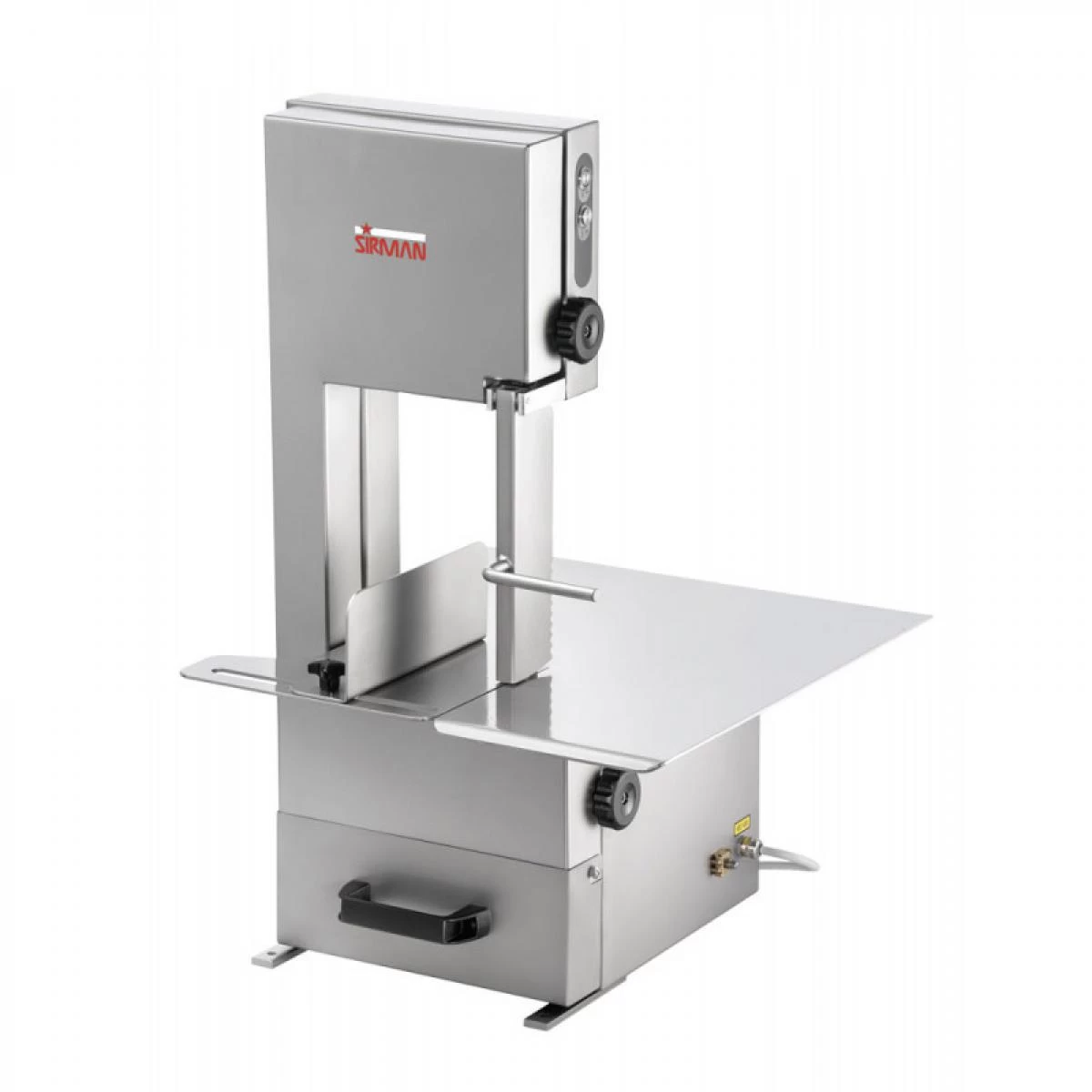 Idéale pour couper les os de produits congelés ou de produits frais, cette scie à os professionnelle est dotée d’une structure autoportante en alliage d’aluminium anodisé, hygiénique et anticorrosive. Elle est équipée d’un plateau pousse viande et d’une équerre guide en acier inox AISI 304 ainsi que d’une lame de 1650 cm de long. Longueur Lame : 1650 mm – Poulie : 210 mm Puissance : 1 Hp / 900 r.p.m Surface de travail : 430 x 545 mm Dimensions : 280 x 545 x H 816 mm Dimensions avec emballage : L 580 x P 720 x H 1050 mm | Poids : 47 kg Voltage : 230V1/50Hz Commande 24 V avec micro-interrupteur de sûreté sur la porte, centrale de contrôle redondante et frein moteur Précision maximales de réglage horizontal et vertical de la poulie supérieure Excellente adhérence de la lame à la poulie grâce au façonnage demi-courbe des poulies et à un réglage précis Coussinets hermétiques sur poulie supérieure Nettoyage aisé grâce aux détails techniques de fabrication : parties électriques ont un degré de protection IP x 5 ou supérieur et en dévissant simplement deux poignées on peut enlever la lame, la poulie supérieure et son support Moteurs asynchrones et ventilés puissants à 4 pôles avec déflecteur d’huile d’étanchéité Elles utilisent des lames trempées de 16 mm pour couper les os des produits congelés ou frais